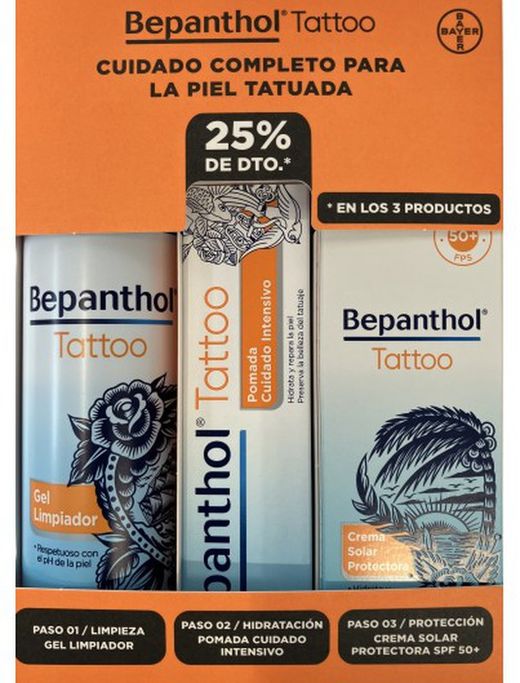 El pack de Bepanthol Tattoo para el cuidado completo de la piel tatuada. Paso 1: limpieza Paso 2: hidratación Paso 3: protección