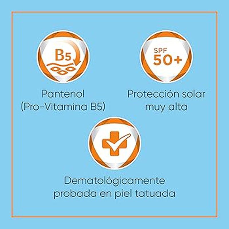 - Crema solar protectora SPF50 para aplicar antes de la exposición solar. Reaplicar con frecuencia.