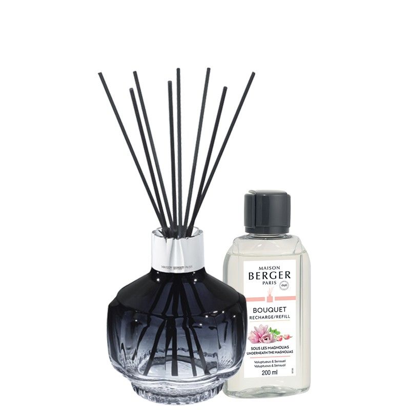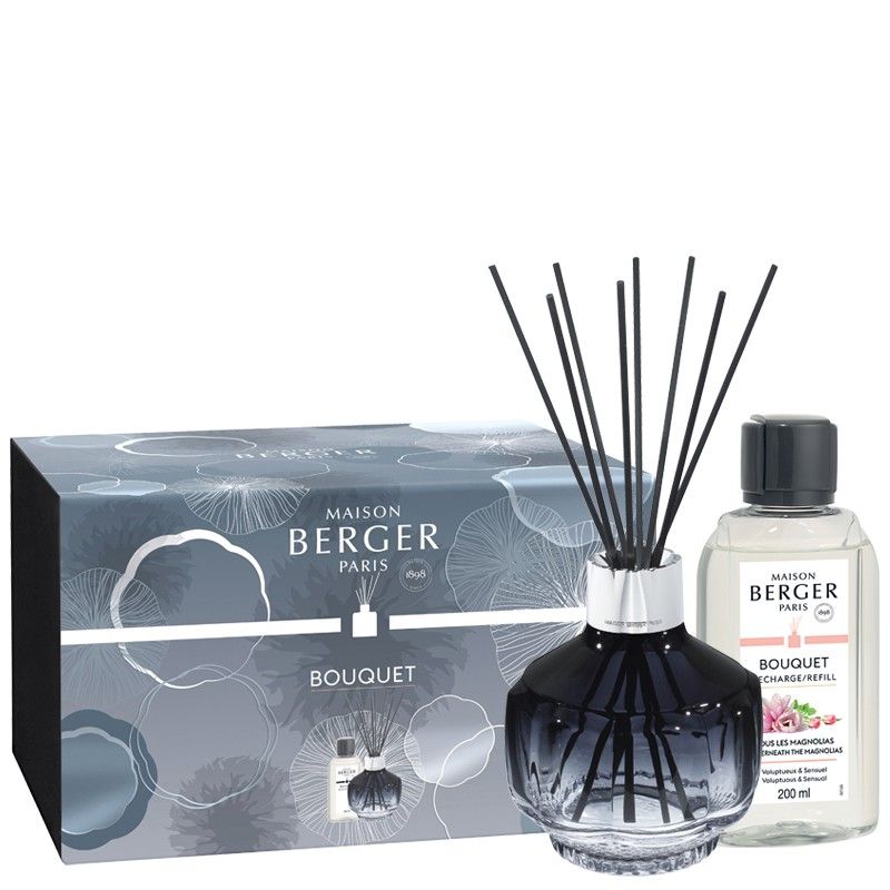 El bouquet diseñado por Serge Rusak de Maison Berger París Molecule Bleu Nuit de aspecto retro tiene un color azul noche muy intenso dando un toque acogedor a la estancia. Viene acompañado de la fragancia Sous Les Magnolias, de aroma floral gracias a la rosa búlgara, el jazmín negro, ámbar y pachulí