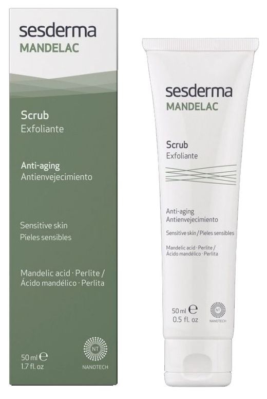 Elimina impurezas y estimula la renovación celular. Exfoliación mecánica de pieles sensibles y muy sensibles. Con ácido mandélico.