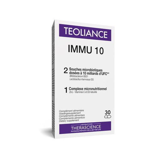 La vitamina C contribuye a mantener el normal funcionamiento del sistema inmune.La vitamina C contribuye a mantener el normal funcionamiento del sistema inmune. Teoliance Inmu 10 es un complemento alimenticio, indicado para adultos, que tiene un efecto probiótico y te ayuda a restablecer tu microbiota intestinal, para reforzar tu sistema inmunológico. Contiene 10 mil millones de UFC por cápsula de 2 cepas diferentes de los probióticos más estudiados y mejor documentadas del mundo: • Bifodobacterium BB12• Lactobacillus Rhamnosus LGG